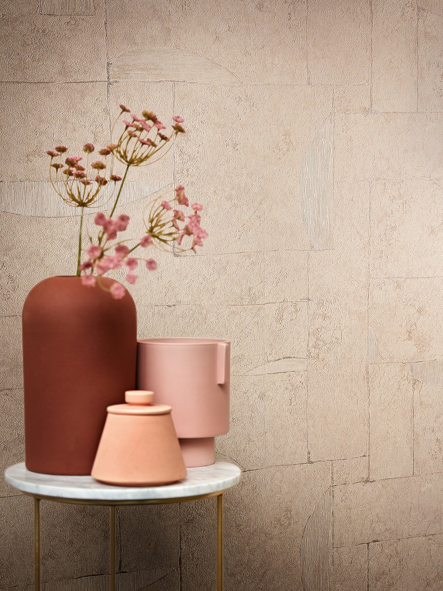 Create a contemporary and stylish space with this beige abstract wallpaper. The unique design features a blend of geometric shapes and textured effects, adding depth and visual interest to any room.